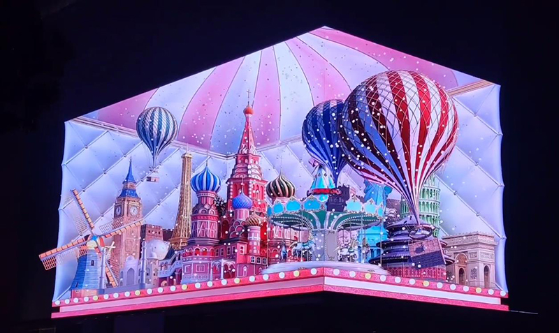 該裸眼3D大屏位于無(wú)錫市中山路上,是無(wú)錫商業(yè)區(qū)對(duì)外展示的窗口項(xiàng)目。屏幕總面積近1038㎡,實(shí)現(xiàn)了5G+8K前沿科技的組合。其中屏體寬61.44米,高16.896米,整個(gè)屏幕由1700萬(wàn)顆LED燈珠構(gòu)成,橫向分辨率達(dá)到7680超高清標(biāo)準(zhǔn),采用90°無(wú)縫轉(zhuǎn)角模組技術(shù)和高對(duì)比吸光面罩技術(shù),實(shí)現(xiàn)多路信號(hào)無(wú)縫切換,具備戶(hù)外高等級(jí)的防水、抗風(fēng)、高清、廣視角等功能。