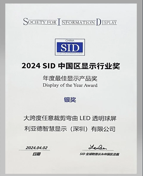 SID大獎(jiǎng),作為全球顯示技術(shù)領(lǐng)域的權(quán)威獎(jiǎng)項(xiàng),匯聚了全球頂尖的設(shè)計(jì)理念和技術(shù)成果。每一屆的評(píng)選都代表著行業(yè)內(nèi)的最高水準(zhǔn),獲獎(jiǎng)產(chǎn)品不僅展示了技術(shù)的前沿性,更是藝術(shù)與科技完美結(jié)合的典范。銀獎(jiǎng)的獲得,無(wú)疑是利亞德在LED顯示技術(shù)領(lǐng)域的一次里程碑式飛躍,標(biāo)志著我們?cè)谕该黠@示技術(shù)上的突破已得到國(guó)際同行的廣泛認(rèn)同。